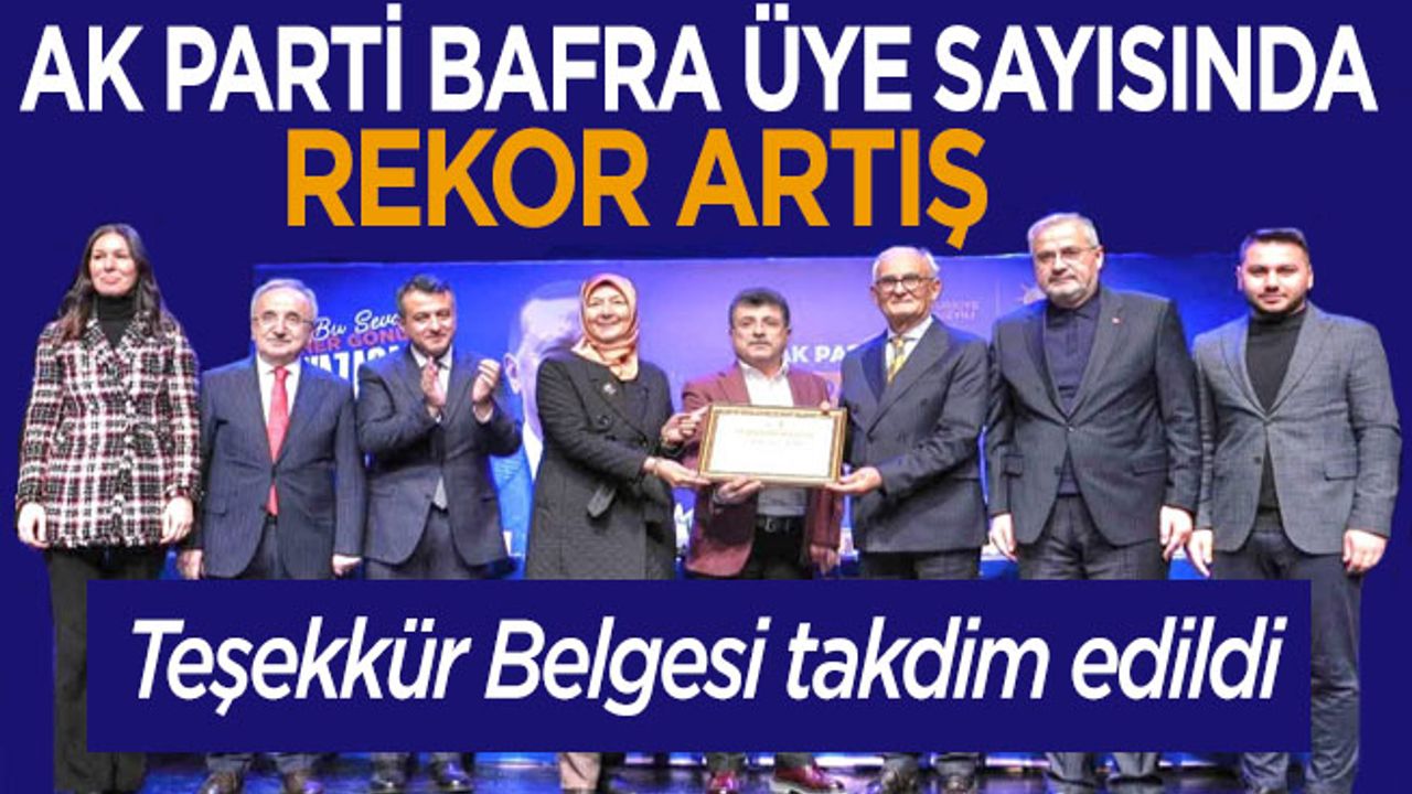 AK Parti’nin üye sayısının 11.543.301 kişiye ulaşmasında Bafra İlçe teşkilatının göstermiş olduğu özveri ve vermiş olduğu desteğe teşekkür için MKYK Üyeleri Yusuf Ziya Yılmaz ile Çiğdem Karaaslan , İl Başkanı Mehmet KÖSE ve Büyükşehir Belediye Başkanı Halit Doğan ; İlçe Başkanı İbrahim Semiz, Belediye Başkanı Hamit Kılıç, Kadın Kolları ve Gençlik Kolları Başkanına "Teşekkür Belgesi" hediye etti.