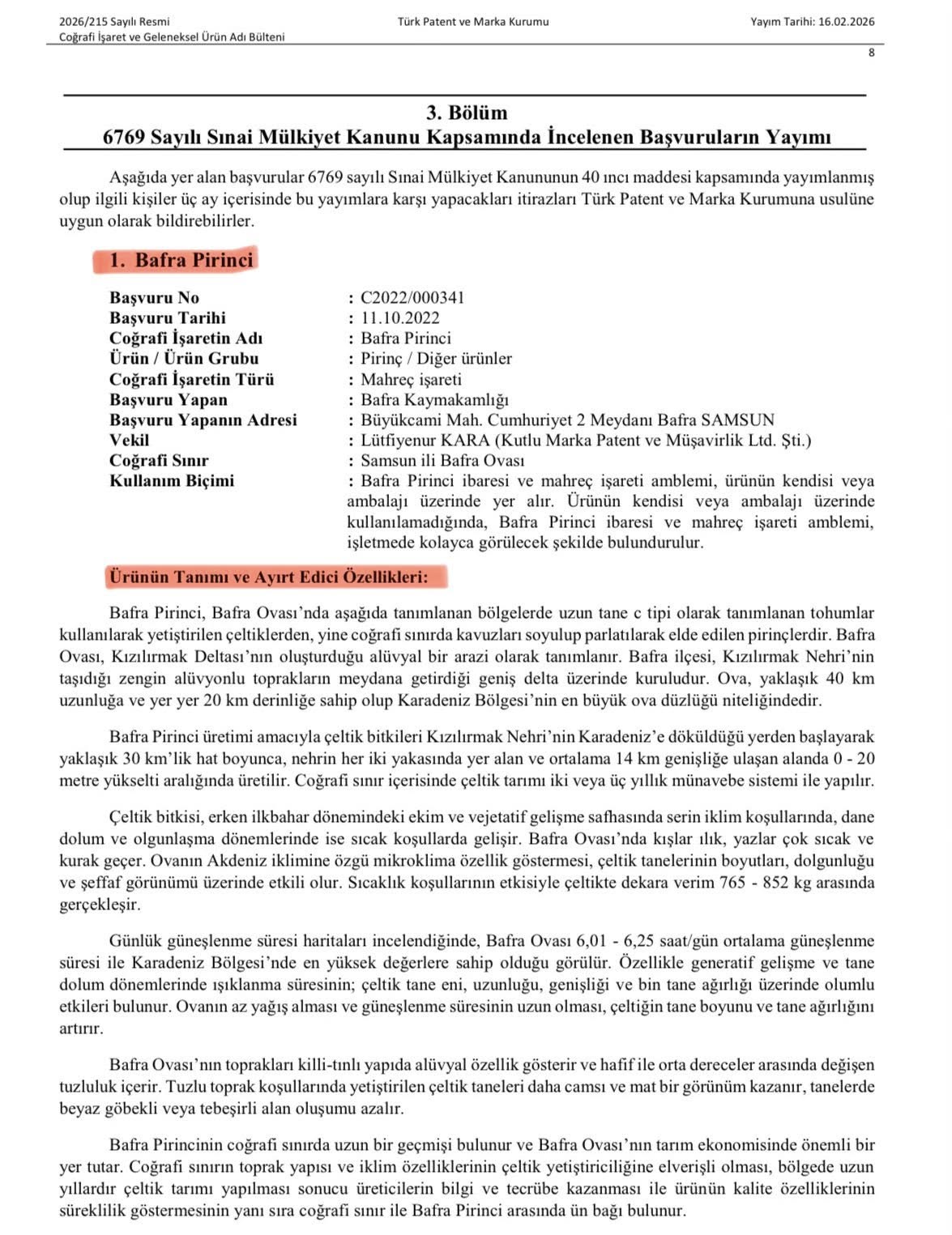 AK Parti Samsun Milletvekili Av. Orhan Kırcalı, Bafra Ovası’nın önemli tarım ürünlerinden biri olan Bafra Pirinci için yapılan coğrafi işaret tescil başvurusunun Türk Patent ve Marka Kurumu bülteninde yayımlandığını açıkladı.