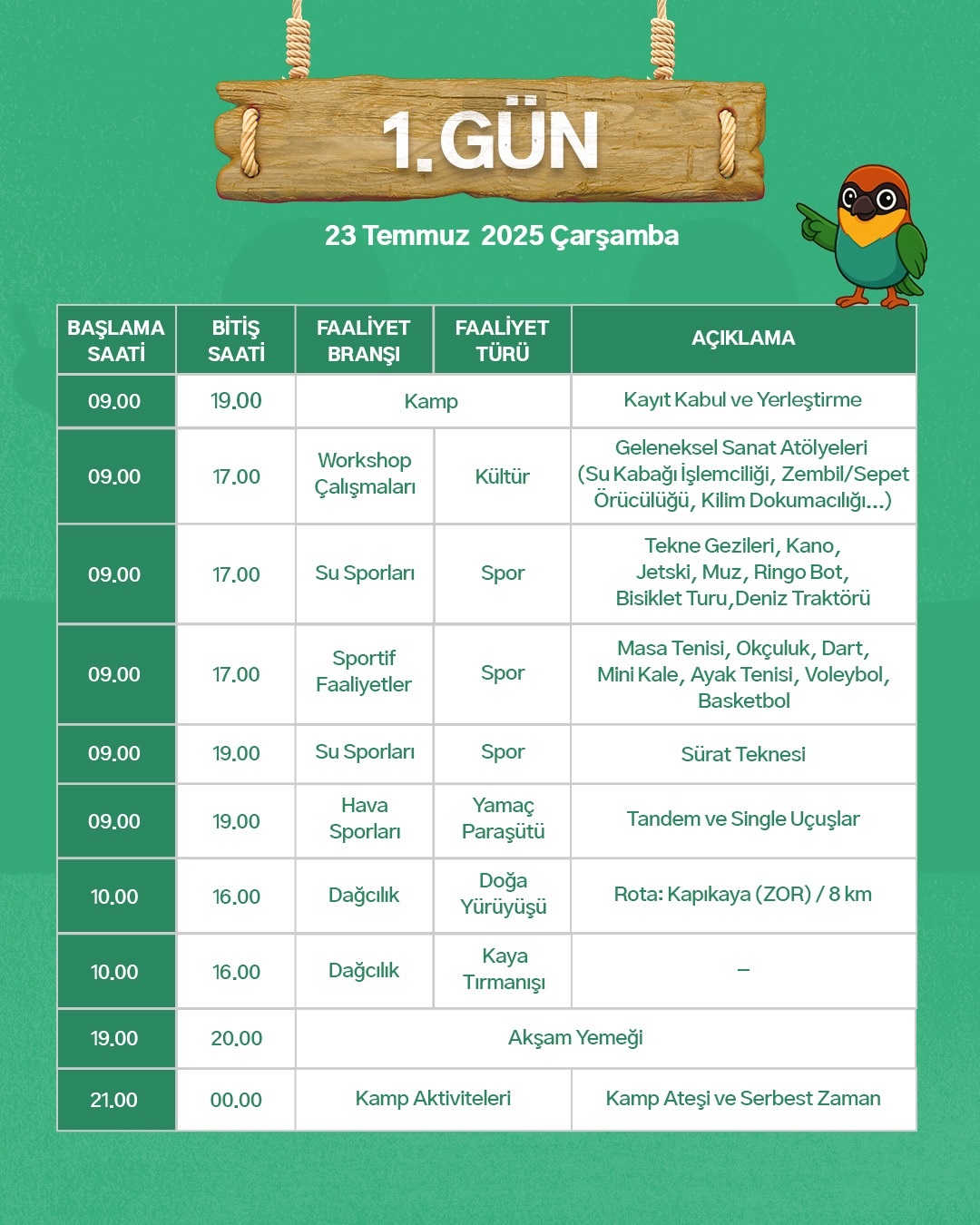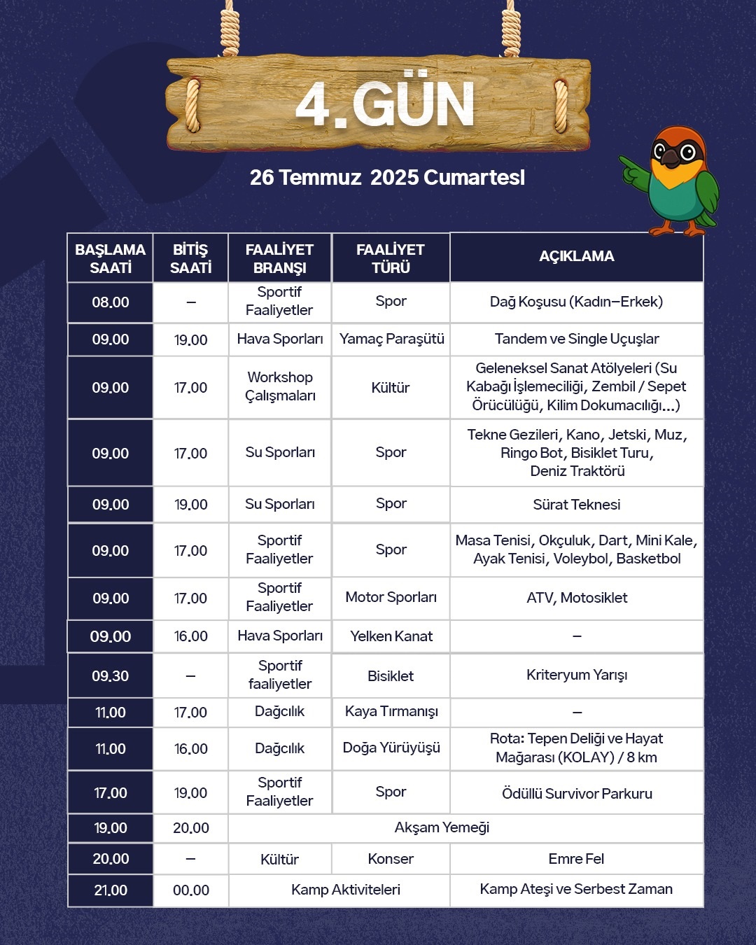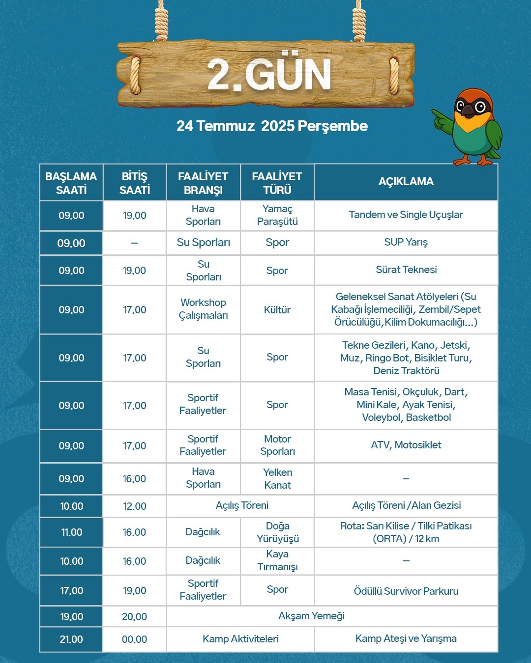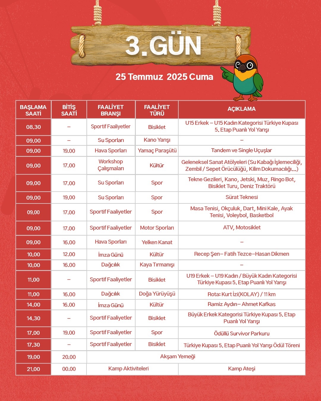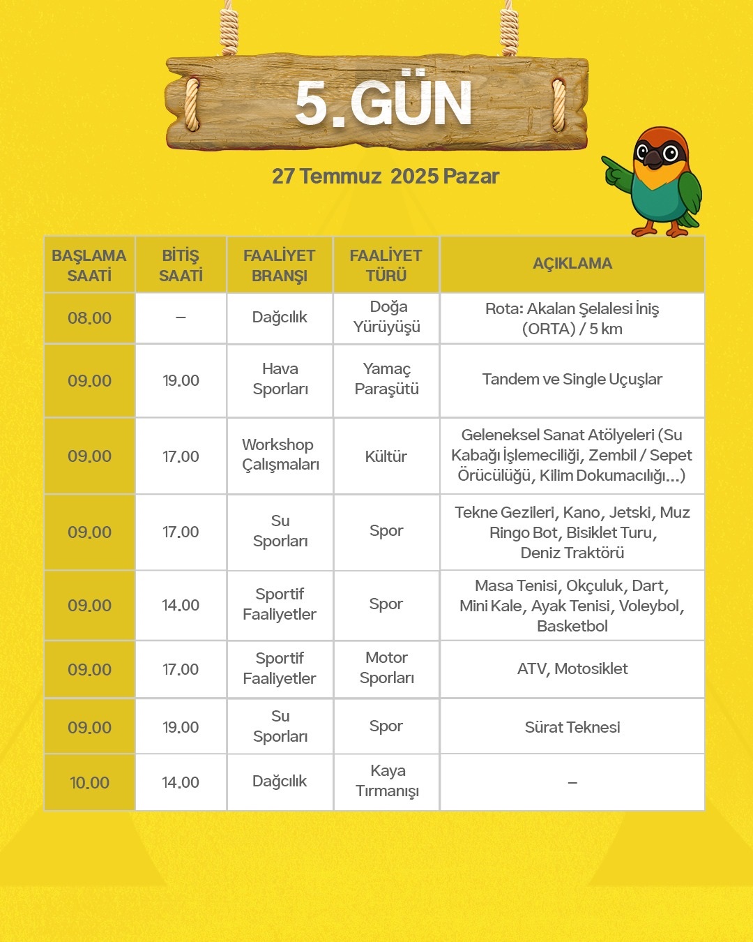 Festivalin son günü olan bugün dağcılık faaliyetleri kapsamında Akalan Şelalesi doğa yürüyüşü, hava sporları, workshop çalışmaları, su sporları, sportif faaliyetler, motor sporları ile katılımcılara keyifli anlar yaşatılacak.