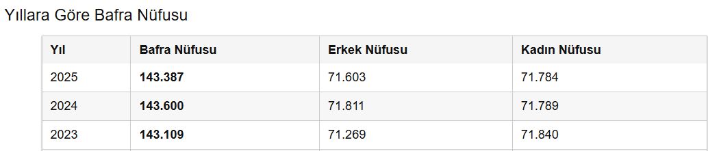 Adrese Dayalı Nüfus Kayıt Sistemi (ADNKS) sonuçlarına göre Türkiye İstatistik Kurumu’nun (TÜİK) Ocak 2026 itibariyle açıkladığı yeni nüfus verilerine göre; Türkiye'nin nüfusu, 2025'te bir önceki yıla göre 427 bin 224 kişi artarak 86 milyon 92 bin 168 kişi oldu. Bafra’nın nüfusu ise 143 bin 387 oldu.