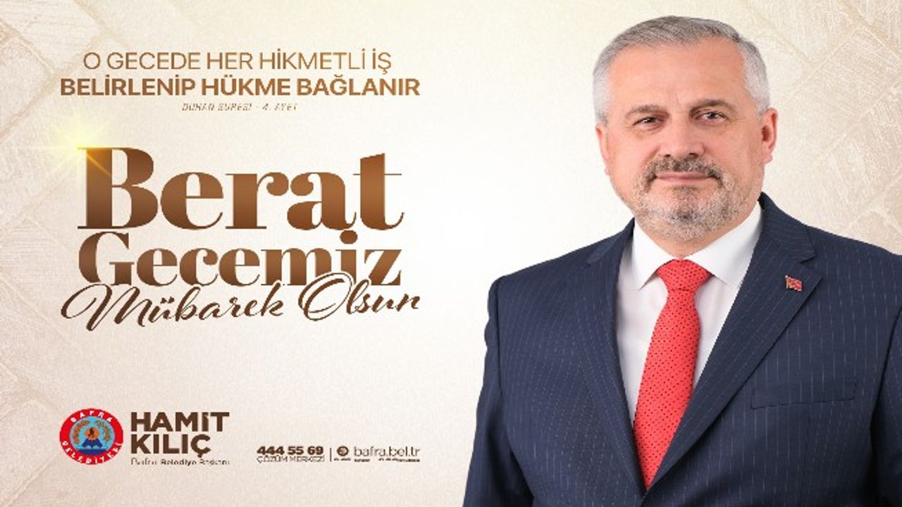 Bu duygu ve düşüncelerle, başta kıymetli Bafralı hemşehrilerim olmak üzere aziz milletimizin ve tüm İslam âleminin Berat Kandili’ni en kalbi duygularımla tebrik ediyor; bu mübarek gecenin ülkemize, milletimize ve tüm insanlığa sağlık, huzur, barış ve hayırlar getirmesini Yüce Allah’tan niyaz ediyorum.”