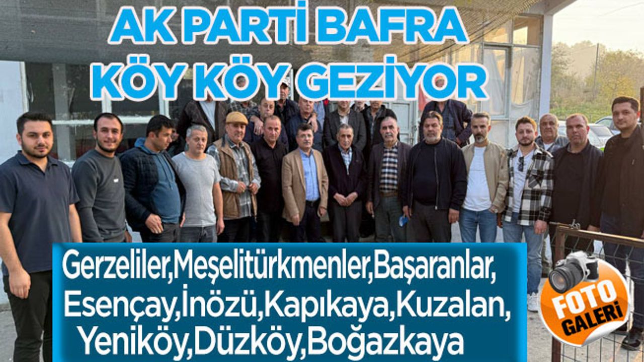 AK Parti Bafra İlçe Başkanı İbrahim Semiz,İlçe Başkan yrd,İlçe yönetim kurulu üyeleri,Belediye Meclis üyeleri,Kadın kolları,gençlik kolları ile GERZELİLER,MEŞELİTÜRKMENLER,BAŞARAN,ESENÇAY,İNÖZÜ, KAPIKAYA,KUZALAN,YENİKÖY,DÜZKÖY VE BOĞAZKAYA MAHALLELERİNİ(KÖY) ziyaret ederek vatandaşlarla biraraya geldi. Köylüler, parti heyetinin ziyaretinden memnuniyet duydu. Köylerde vatandaşların dilek ve isteklerini dinleyen AK Parti Bafra teşkilatı bir yandan vatandaşların sorun ve taleplerini dinlerken bir yandan da Gönül Seferberliği kapsamında üye çalışmaları gerçekleştirdi.