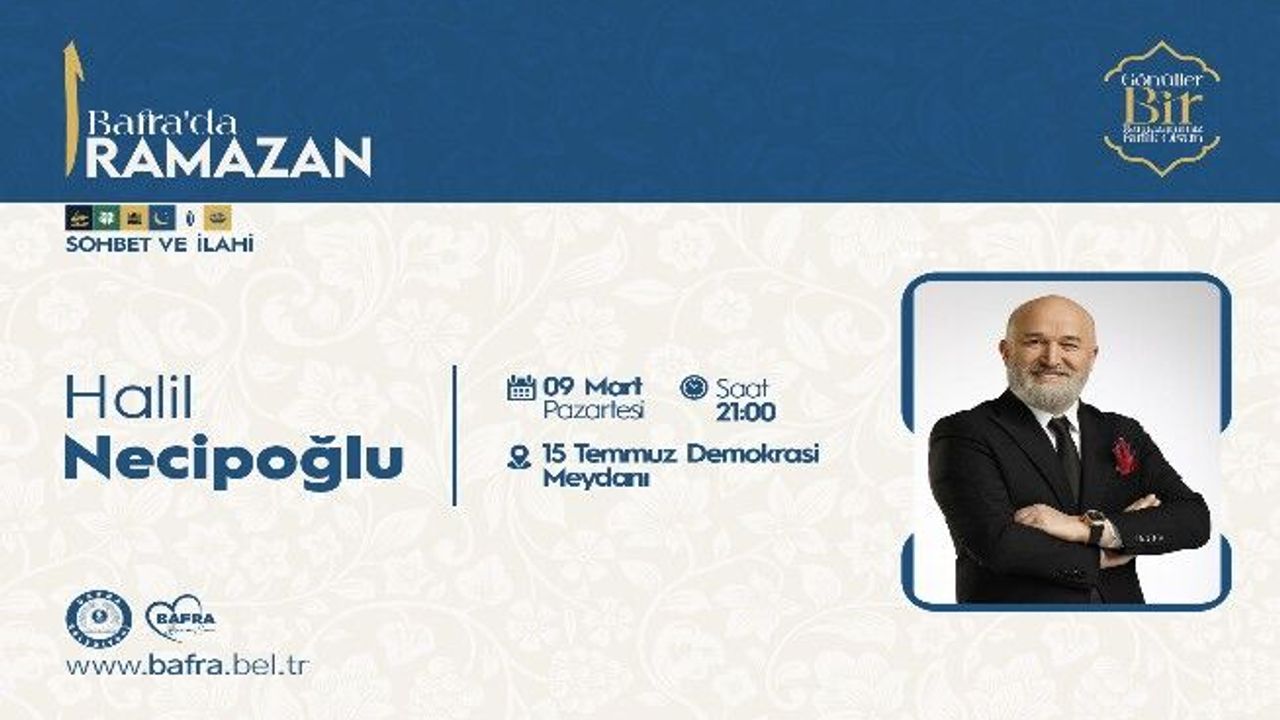 Halil Necipoğlu, Ramazan-ı Şerif’in manevi derinliğini, hikmetini, bereketini ve geleneksel ruhunu yansıtan ramazannâme konulu sohbet programıyla vatandaşlar ile buluşacak ve gönülleri sükûnete davet eden ilahileriyle Bafra’da Ramazan akşamlarına ayrı bir anlam katacak.