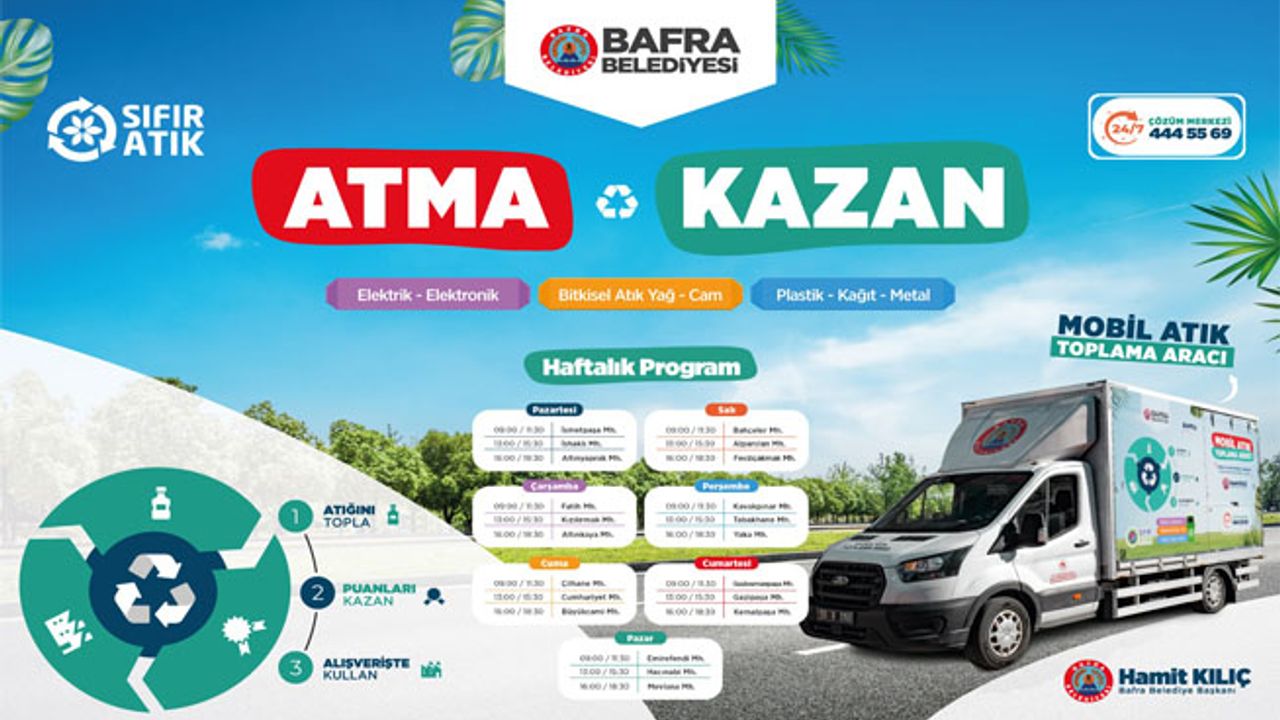 Belediye Başkanı Hamit Kılıç, Bafra Belediyesi Kartlı Mobil Atık Otobüsü ve atma kazanalım sistemi kapsamında Entegre Katı Atık Yönetim Sistemi anlayışı, geri kazanılabilir atıkların toplama günleri oluşturularak etkin bir şekilde yönetimini (geri dönüşüme ve ekonomiye kazandırılması) hedeflendiğini bildirdi.