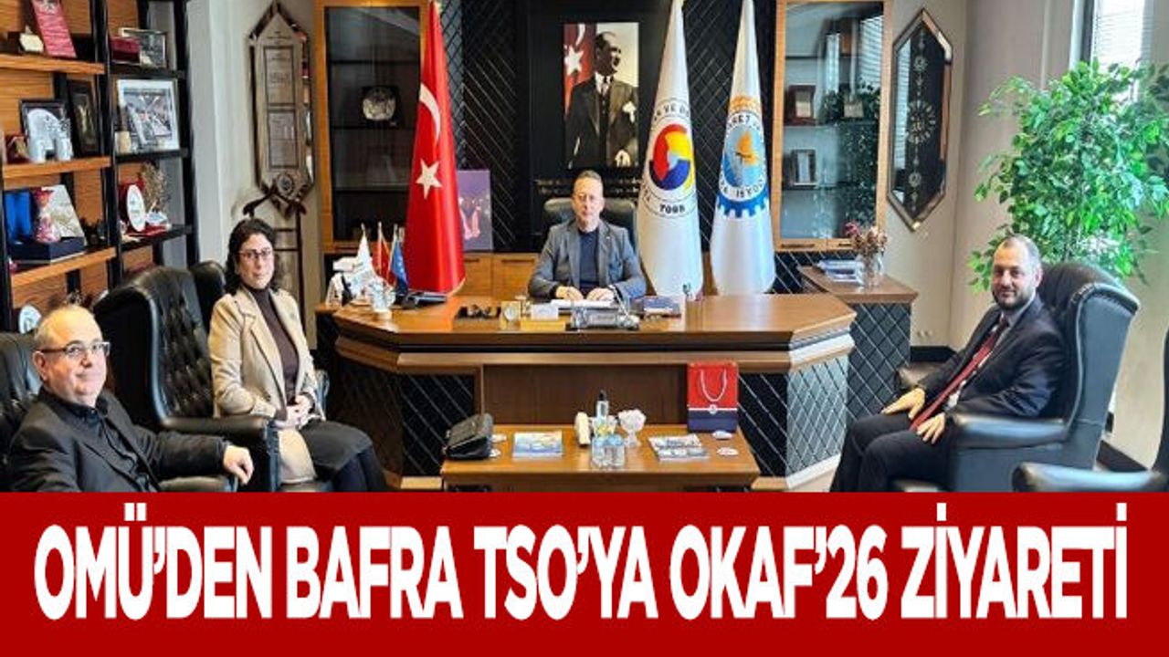 Ondokuz Mayıs Üniversitesi Kariyer Merkezi Müdürü Prof. Dr. Ayşenur Büyükgöze Kavas ve OKAF’26 Düzenleme Kurulu Üyesi Dr. Öğr. Üyesi Alaattin Altın, Orta Karadeniz Kariyer Fuarı (OKAF’26) hazırlıkları kapsamında Bafra Ticaret ve Sanayi Odası Yönetim Kurulu Başkanı Serdal Sefa Kocabaş’ı ziyaret etti.
