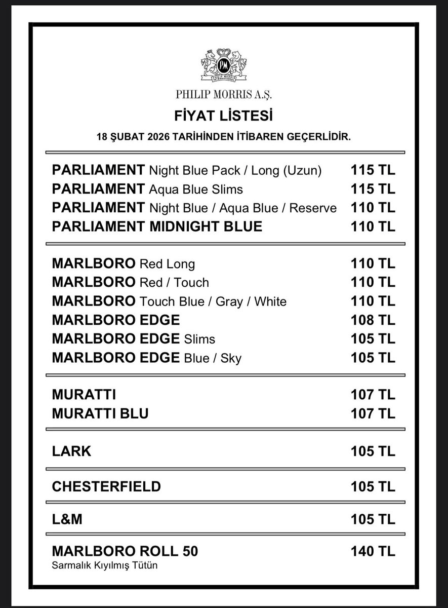 Philip Morris grubuna ait sigaralara zam yapıldı. Güncellenen fiyat listesi 18 Şubat 2026 tarihinden itibaren geçerli olurken, Parliament ve Marlboro başta olmak üzere birçok üründe fiyat artışı dikkat çekti.