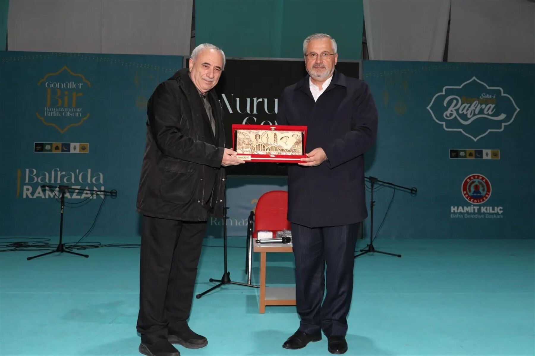 Gecenin sonunda Bafra Belediye Başkanı Hamit Kılıç, Şair ve Yazar Nurullah Genç’e Çetinkaya Köprüsü’nü temsil eden kabartma rölyef tablo takdim etti.