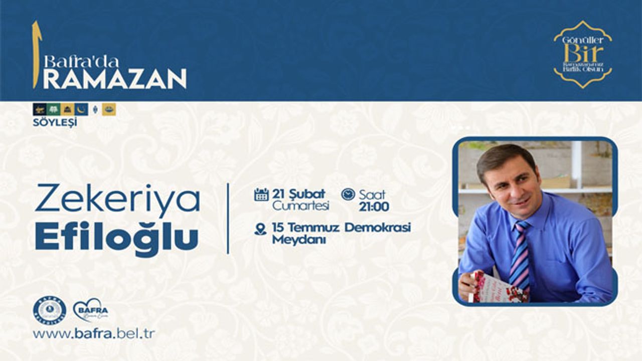 Ramazan’ın manevi atmosferini, sevinç ve coşkusunu paylaşmak amacıyla düzenlenecek olan programda Efiloğlu, “Değerlerine sahip çık, Hayatını Şekillendir” konulu söyleşi gerçekleştirerek hemşehrilerimizle bir araya gelecek.